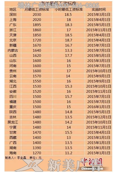 调整以后,深圳、上海两地月最低工资标甘肃墙体广告准分别为2030元、2020元,最低工资标准超越2000元大关。而小时最低工资标准最高的仍然是北京,到达18.7元。